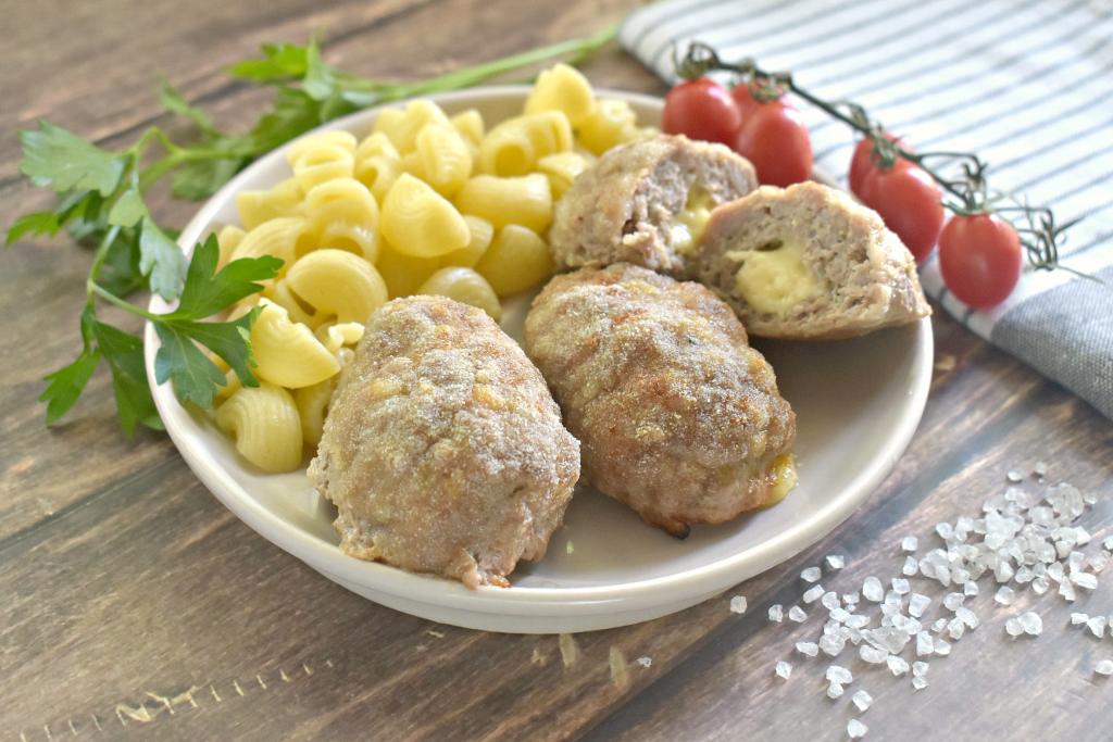 Сочные, вкусные, нежные котлеты с сырной начинкой, запечённые в духовке, к столу можно подать практически с любым гарниром (я подала с макаронами).