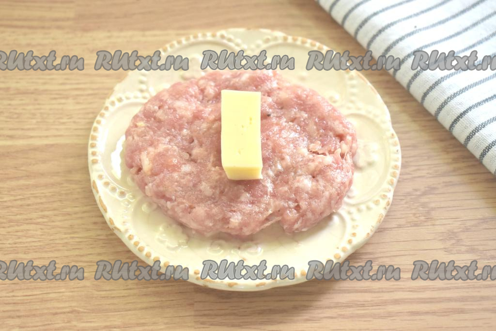 В центр каждой мясной лепёшки выкладываем небольшой брусочек твёрдого сыра (я выкладывала на каждую лепёшку брусочек сыра весом 10 грамм).