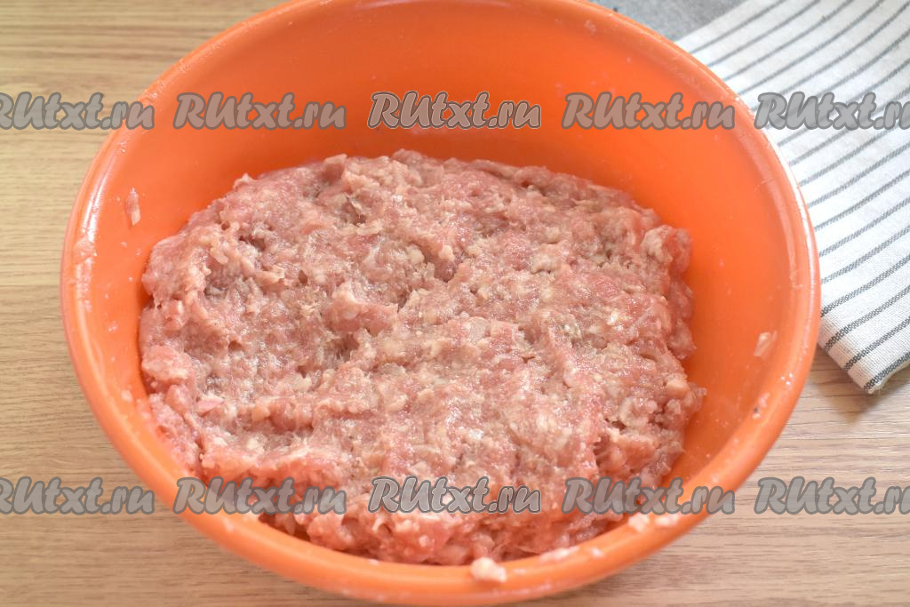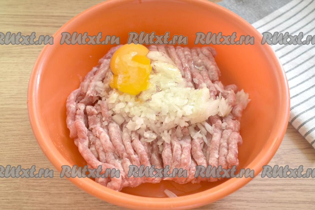 Мясо моем (я взяла кусочки говядины и свинины), пропускаем через мясорубку (можно взять и покупной фарш). Перекладываем фарш в миску. Очищенную луковицу мелко нарезаем (или пропускаем через мясорубку), добавляем к фаршу, сюда же разбиваем куриное яйцо.