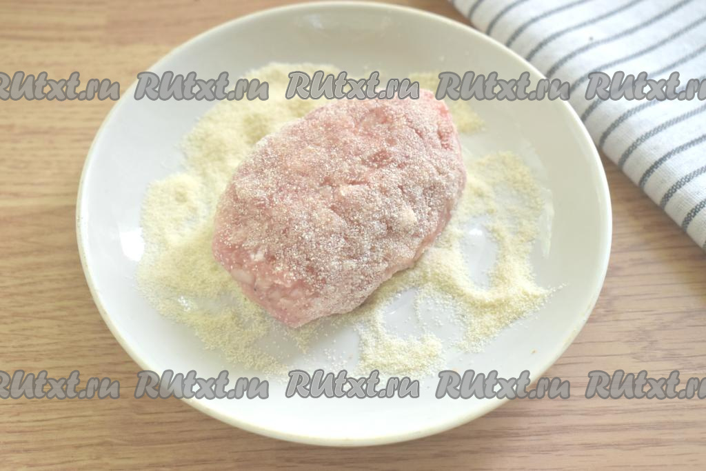 Поднимаем края лепёшки над сыром, формируя котлету (сыр должен быть внутри котлеты), хорошо скрепляем края. Сформированную котлету обваливаем со всех сторон в манке (или в панировочных сухарях). Аналогично формируем все котлеты (у нас получатся 6 штук).