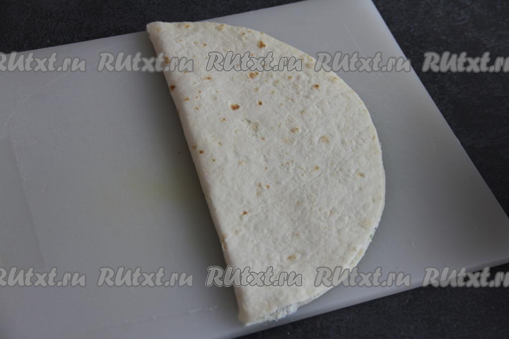 Чистой половиной лепёшки накрыть половину тортильи с начинкой и слегка прижать.