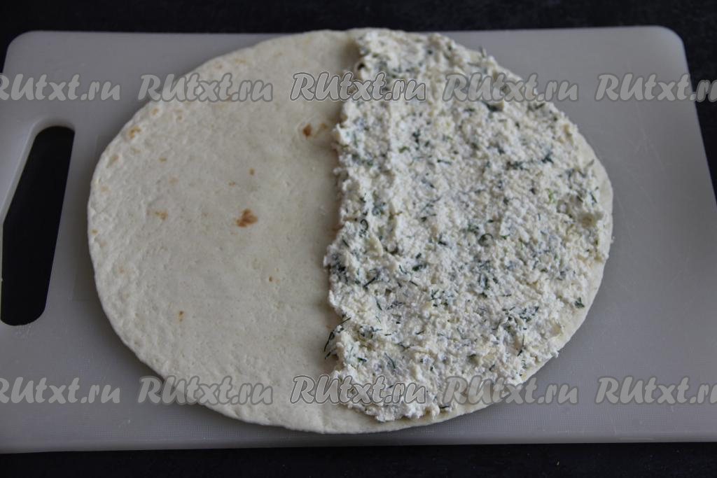 Начинку разделить на три части (то есть на столько частей, сколько у нас лепёшек). На плоскую поверхность поместить одну лепёшку, на половину этой тортилья выложить одну часть творожно-сырной начинки и равномерно распределить, как на фото.