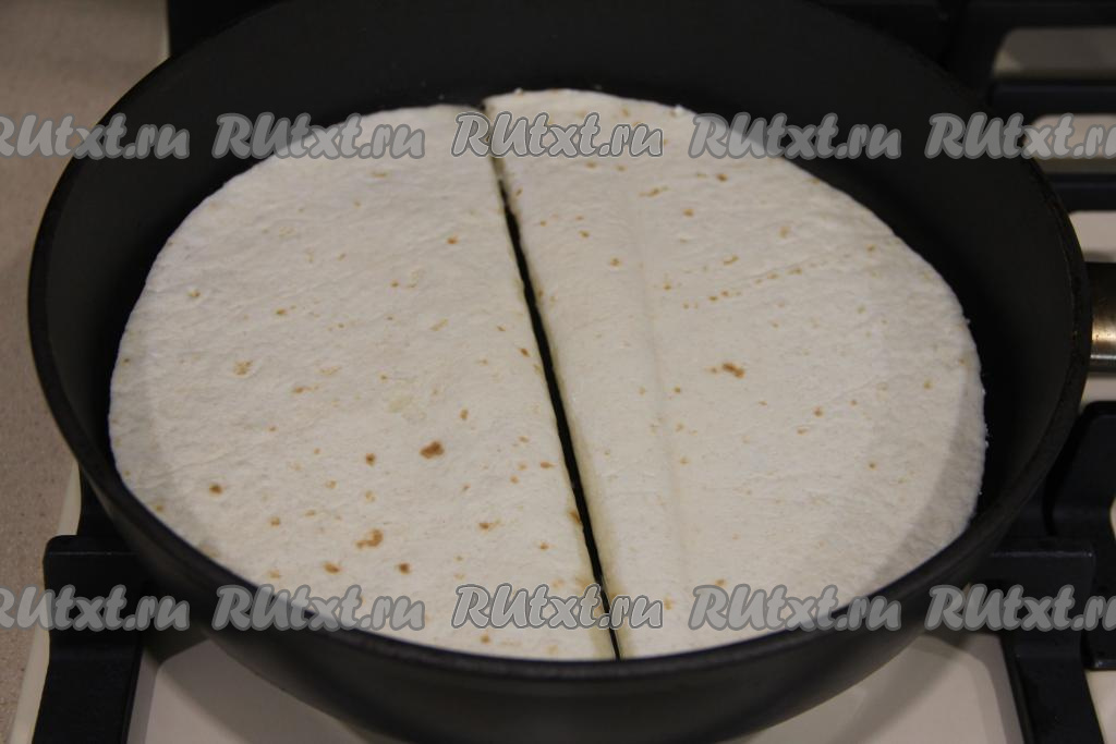 Жарить тортилью на среднем огне с двух сторон до золотистого цвета.