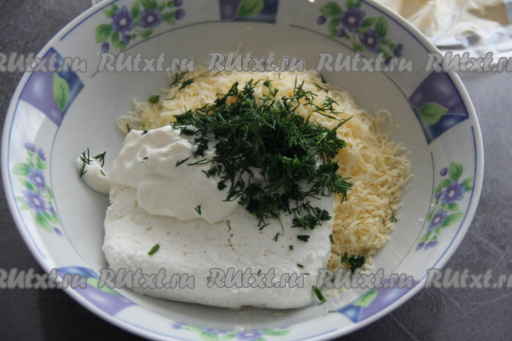 К сыру и творогу добавить сметану и мелко нарезанный укроп.