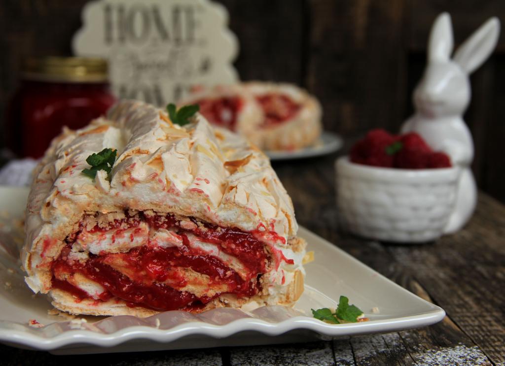 Поместить меренговый рулет с малиной в холодильник на пару часов, а затем нарезать на кусочки и подать к столу. Этот десерт, приготовленный в домашних условиях, получается восхитительно вкусным.