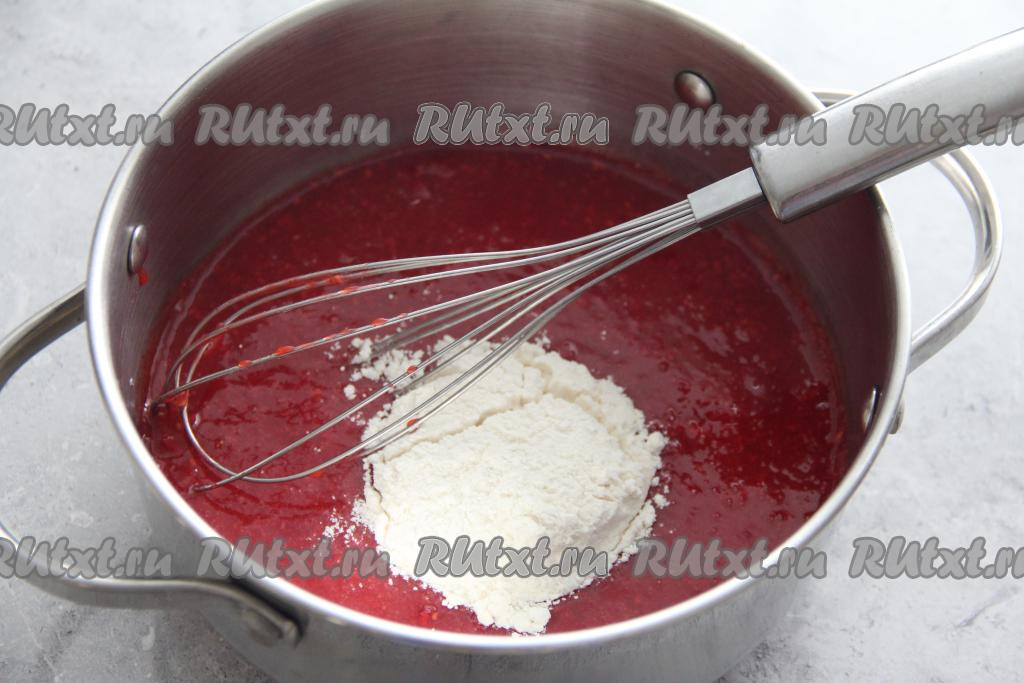 Перелить получившуюся ягодную массу в кастрюлю, добавить сахар и крахмал, перемешать и поставить на средний огонь.