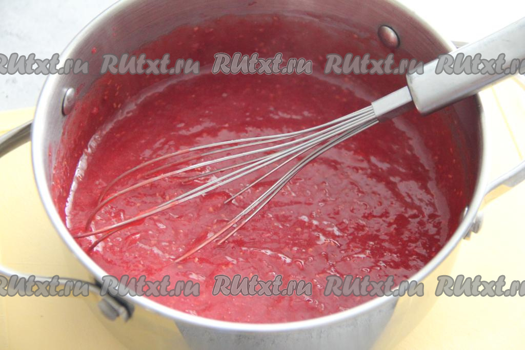 Постоянно помешивая, довести ягодную массу до кипения, а затем варить до загустения (минуты 2-3), убрать с огня, полностью остудить и малиновая начинка для меренгового рулета готова.