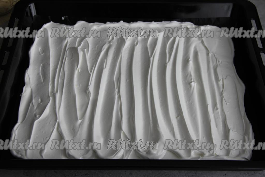 Выложить взбитые белки на противень (у меня противень размером 35 сантиметров на 40 сантиметров), застеленный ковриком (или пергаментной бумагой) для выпечки. Разровнять белковую массу силиконовой лопаткой (или ложкой) и сформировать волны.