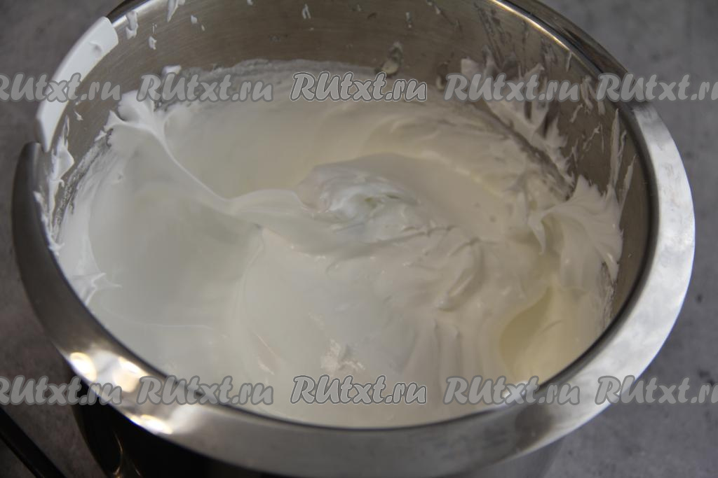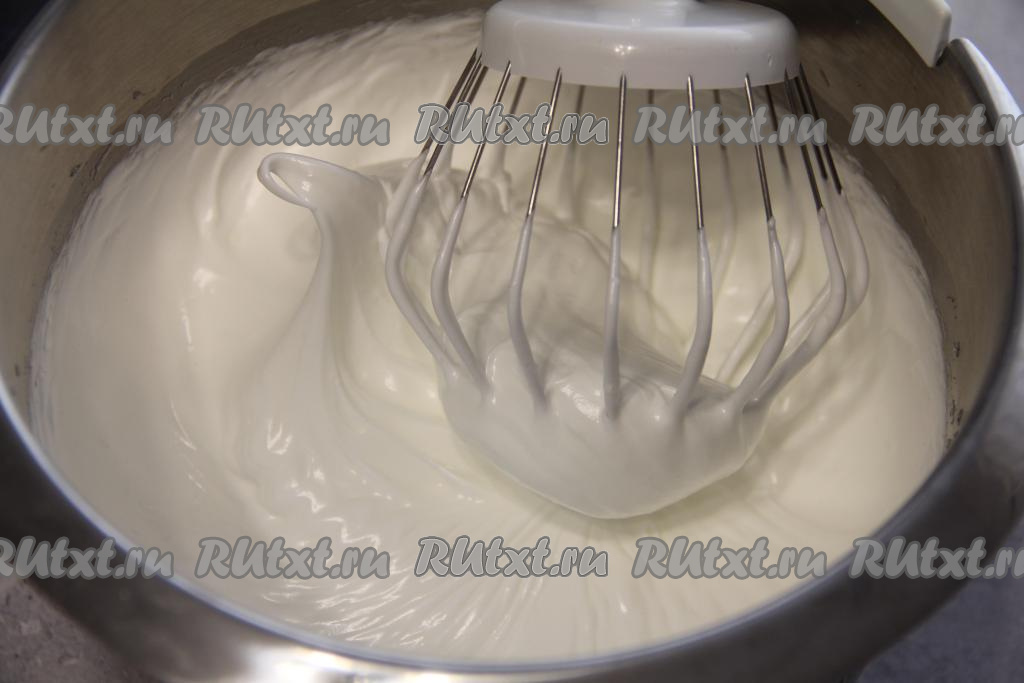 Затем во взбитые белки влить лимонный сок, добавить крахмал и взбивать 1 минуту. Масса получится воздушной, она будет хорошо держать рельеф.