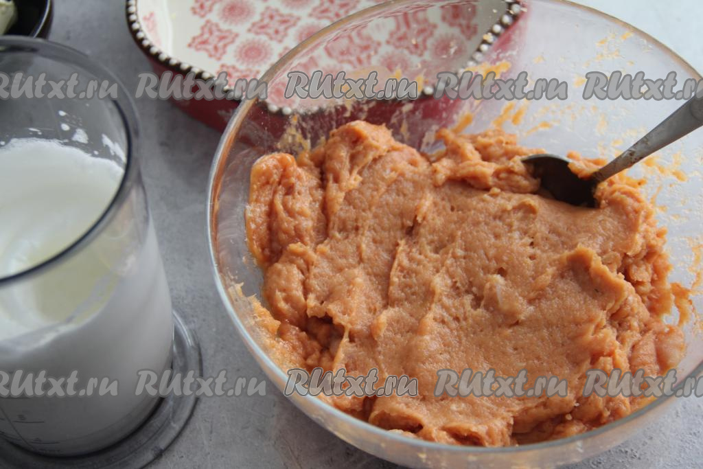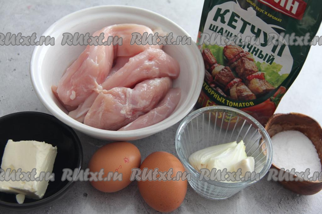Пробить массу до однородного состояния. Если нет измельчителя, можно пробить куриное мясо с кетчупом, желтками, луком и чесноком до однородности погружным блендером. Охлаждённые белки взбить миксером до стойких пиков.