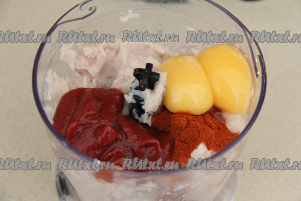 В чашу измельчителя поместить куриное филе, нарезанное на части, яичные желтки, соль, кетчуп (или томатный соус), специи (у меня - паприка), лук, разрезанный на части, и чеснок.