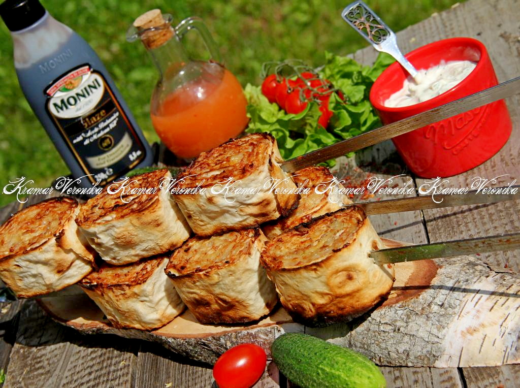 Жарить лаваш с начинкой из фарша и сыра, часто переворачивая, чтобы фарш как следует прожарился. Во время жарки рулетики станут золотистого цвета. Я жарила, примерно, 12-15 минут, но многое зависит от величины рулетиков и от жара вашего мангала.