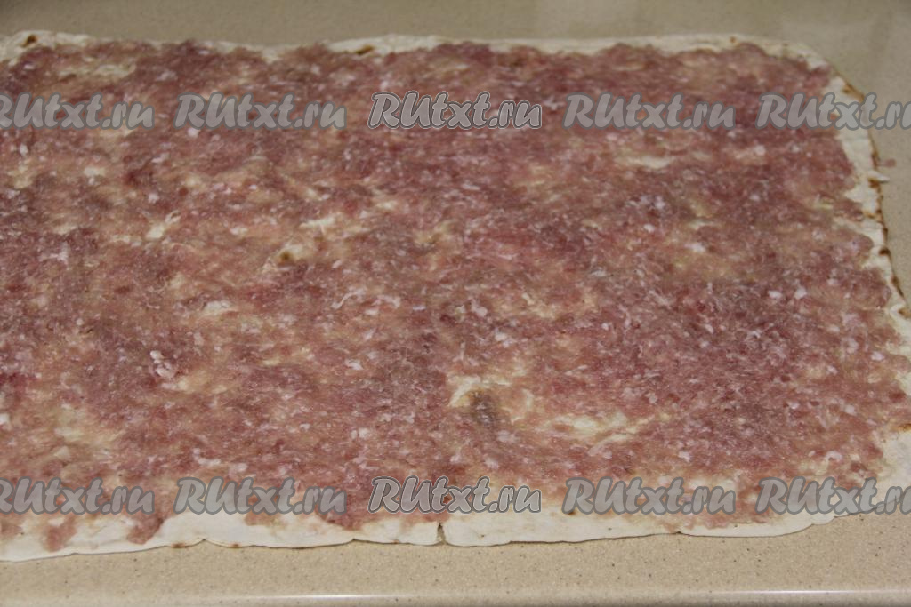 Выложить фарш на лист лаваша и равномерно размазать по всей поверхности тонким, однородным слоем.