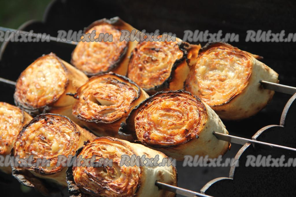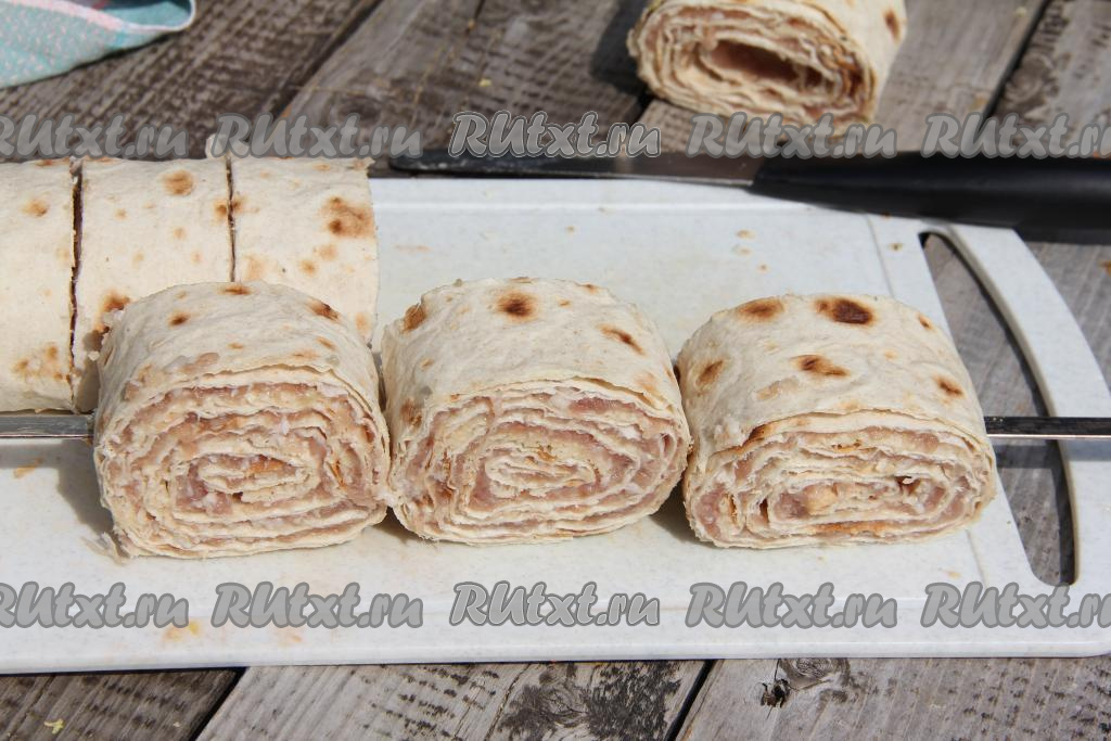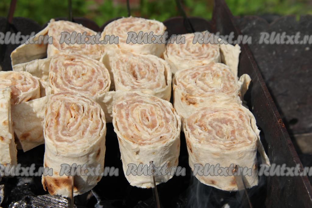 Выложить шампуры с лавашем на мангал срезом вниз. Жар мангала должен быть не очень сильным, прямого огня быть не должно.