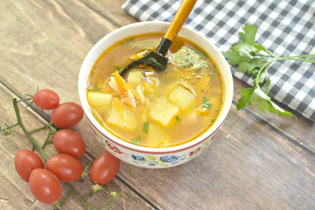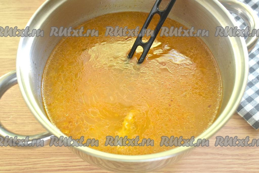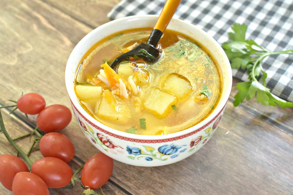 Рис промываем, даём немного стечь воде. После того как картошка проварится 5 минут, добавляем в кастрюлю рис, даём куриному супу закипеть и варим его на небольшом огне 15 минут.