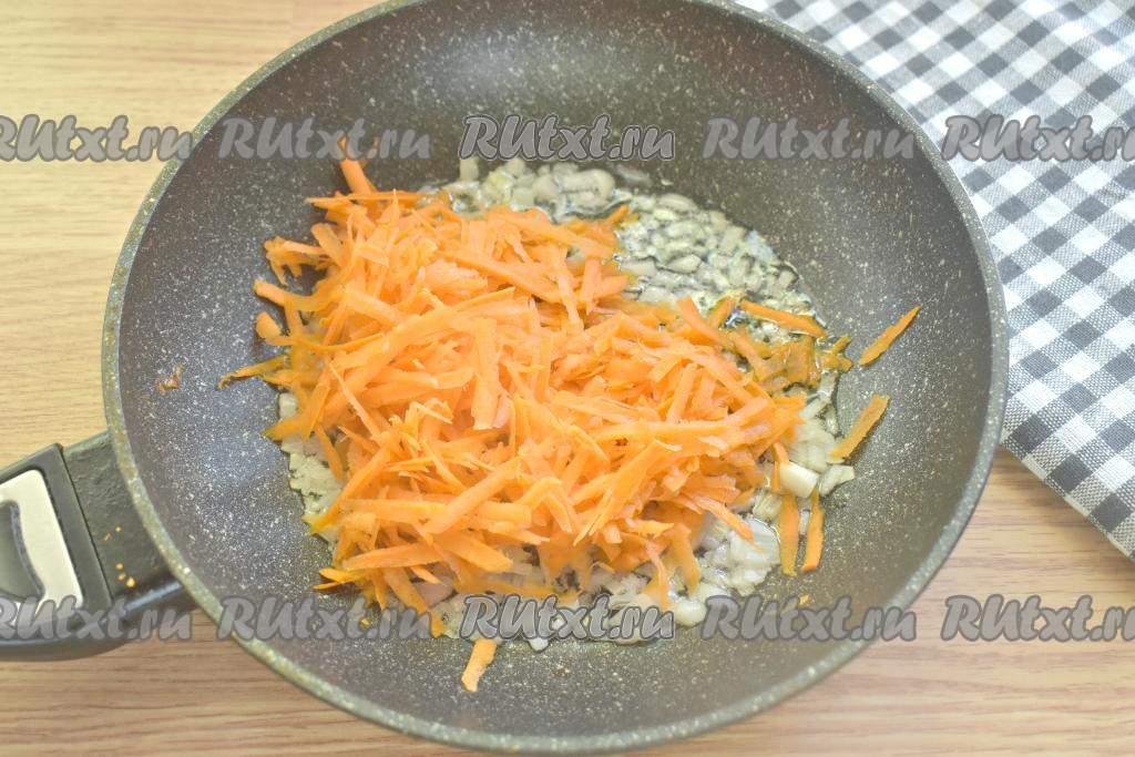 К луку, обжаренному до мягкости, добавляем натёртую на крупной тёрке морковь.