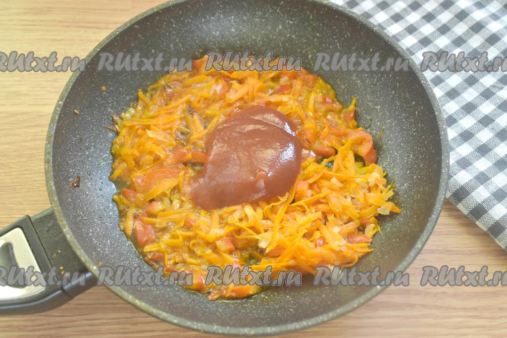 К овощам на сковороду добавляем томатную пасту и 3-4 столовых ложки бульона из кастрюли, перемешиваем и тушим овощи на небольшом огне 3 минуты.