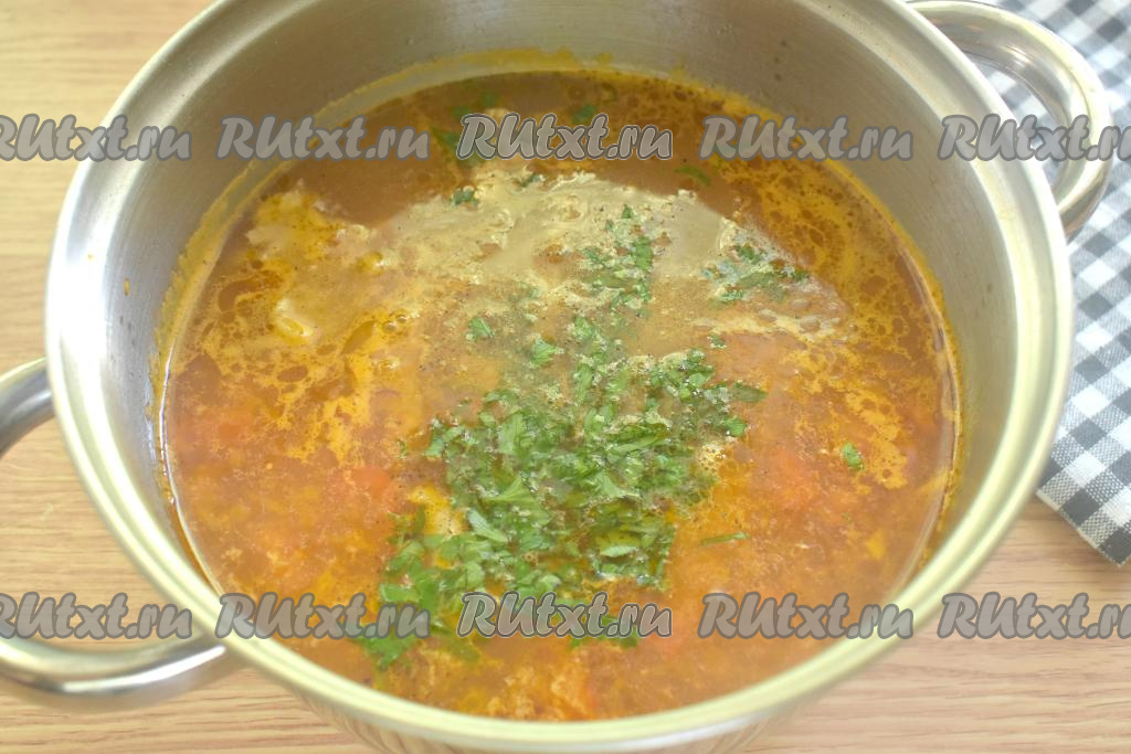 В конце приготовления перчим, если нужно, досаливаем. Затем добавляем мелко нарезанную зелень, доводим до кипения, провариваем 1 минуту и убираем с огня.