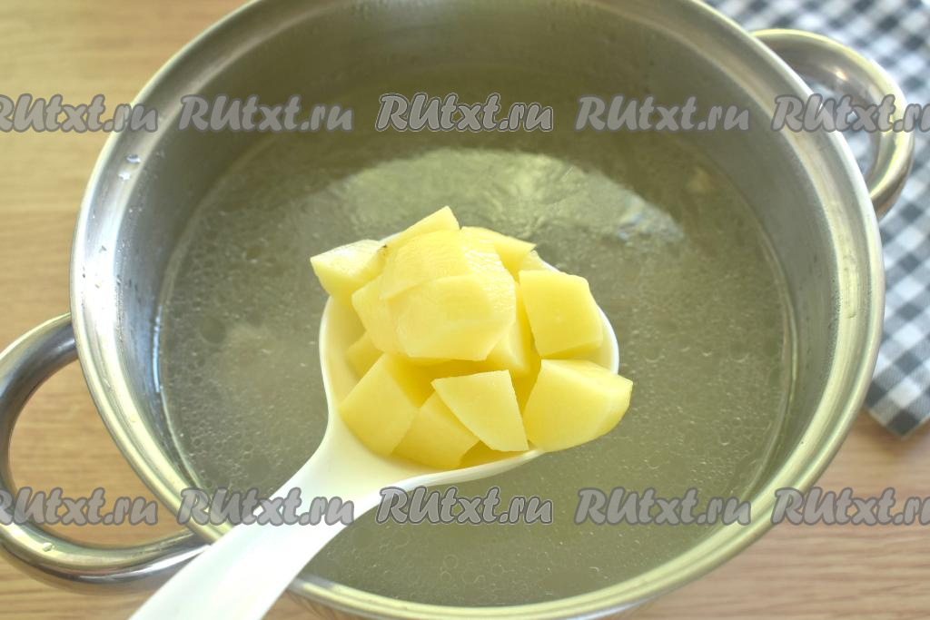 Бульон с куриным мясом ставим на огонь, даём ему закипеть. Картошку, морковку и лук очищаем, из болгарского перца убираем семена и плодоножку. В закипевший бульон выкладываем картофель, нарезанный на небольшие кубики, даём закипеть и варим 5 минут на умеренном огне.