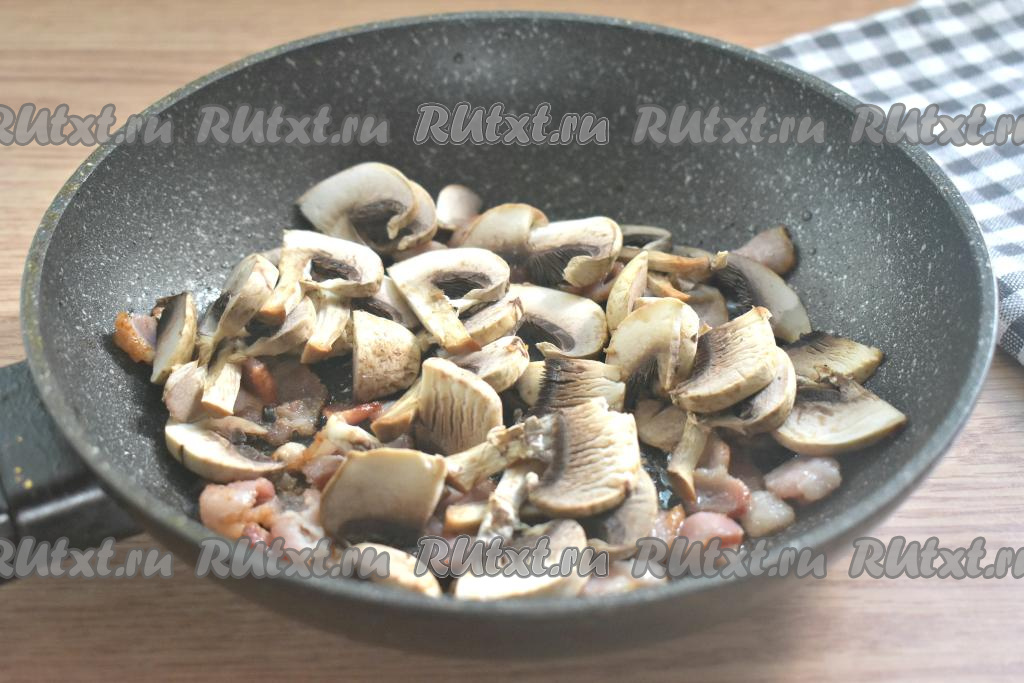 К обжаренному бекону выкладываем шампиньоны, нарезанные на пластины, перемешиваем и обжариваем 5 минут, время от времени помешивая.