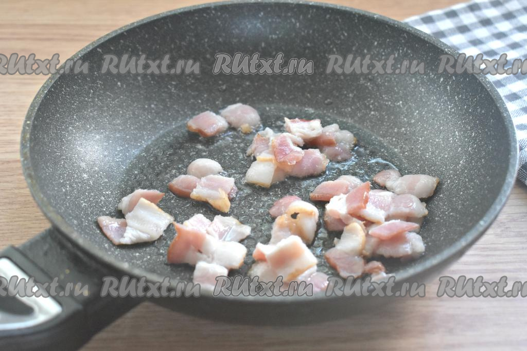 Шампиньоны моем, даём им немного обсохнуть. Разогреваем на сковороде растительное масло. Полоски бекона нарезаем на небольшие кусочки, выкладываем в горячее масло на сковороду и, периодически перемешивая, обжариваем 2 минуты на среднем огне.