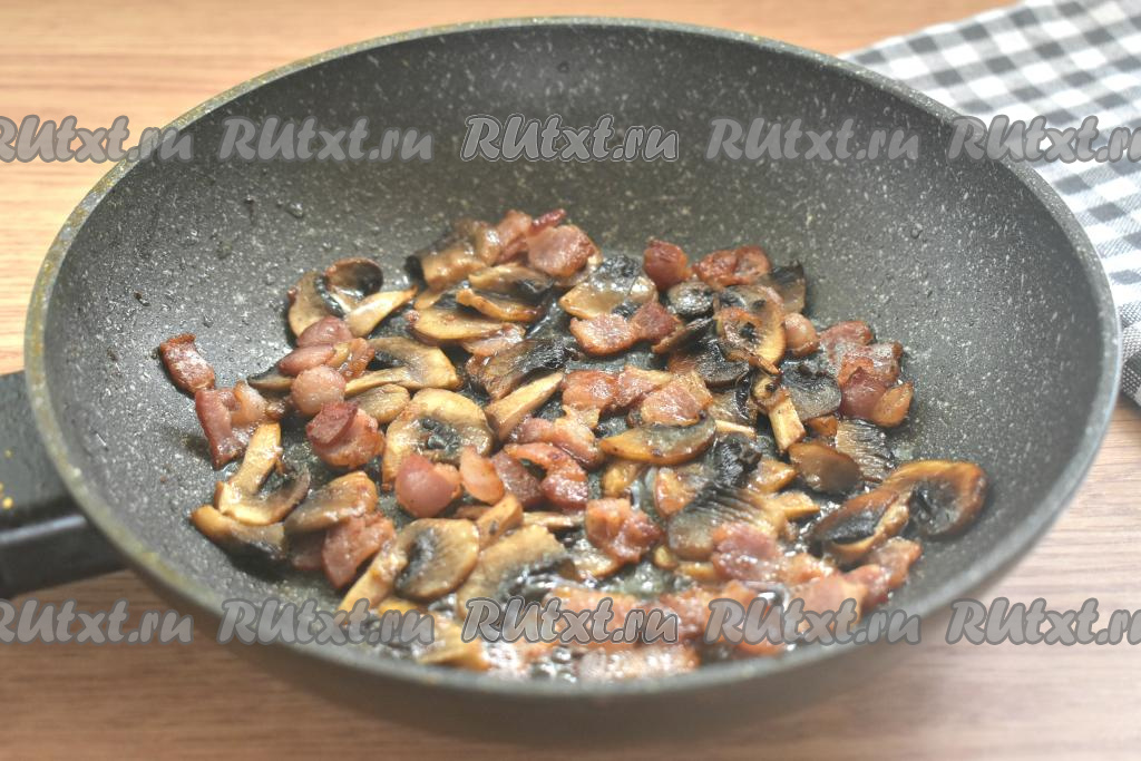 Обжаренные бекон с грибами равномерно распределяем по сковороде.