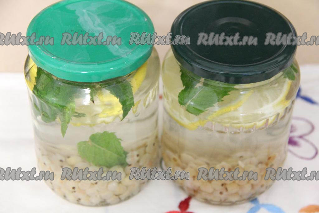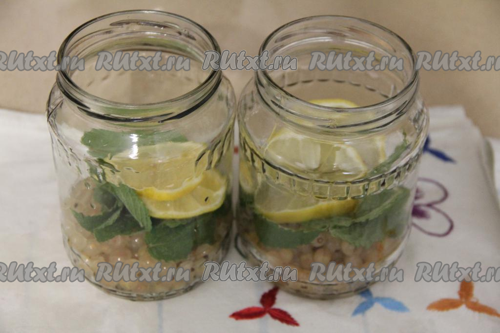 В каждую банку выложить 100 грамм белой смородины, 5 листиков мяты и 2 кружочка лимона.