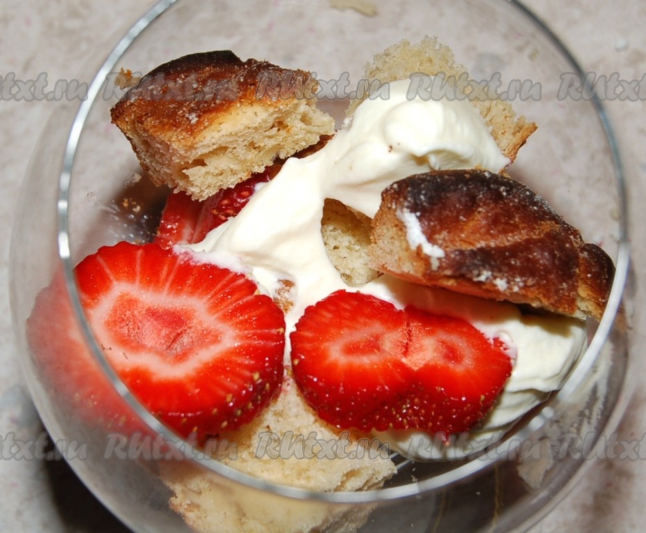 Взять фужер и собрать в него поочередно кусочки кулича с клубникой, переслаивая их взбитыми сливками. Можно взять большую вазу и в нее уложить остатки кулича (смотря сколько у вас осталось кулича).
