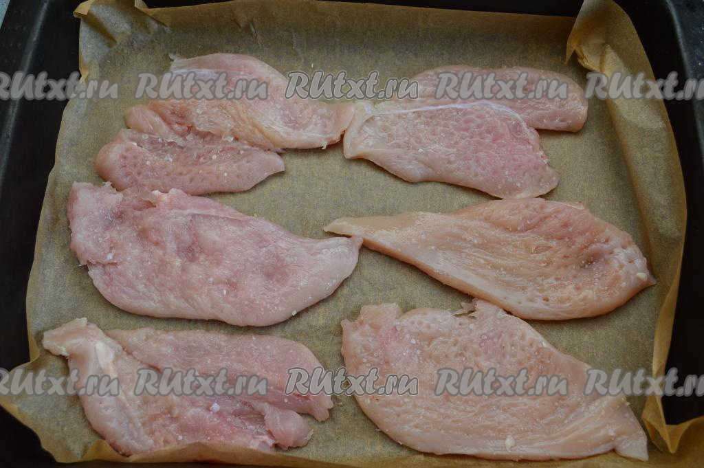 Противень застелить пергаментной бумагой (или фольгой), затем выложить куриные отбивные, посолить их по вкусу.