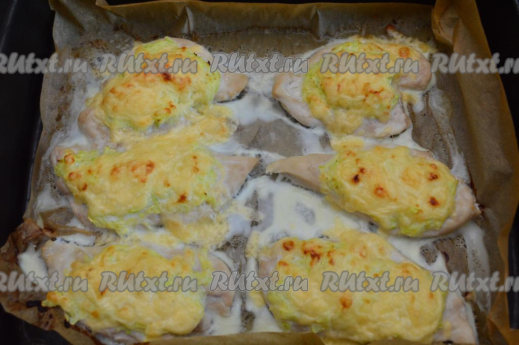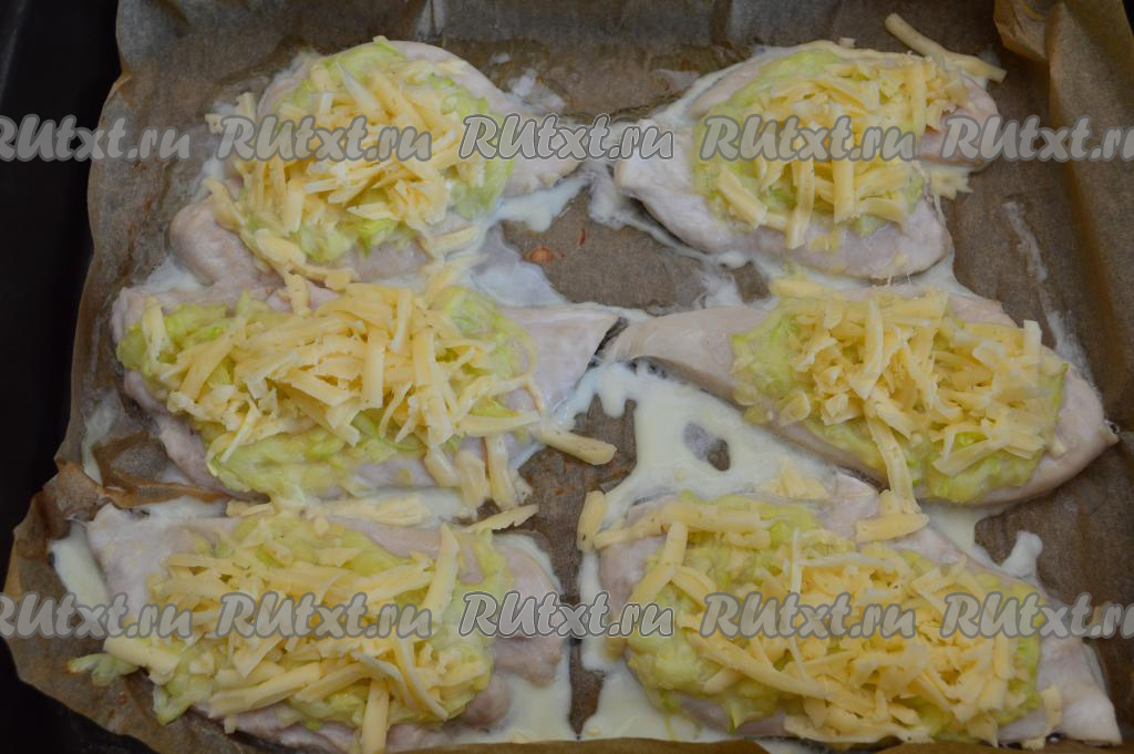 Поэтому сразу разместить смесь кабачков и яиц ровным слоем поверх куриных отбивных и отправить в разогретую до 190 градусов духовку на 15 минут.
