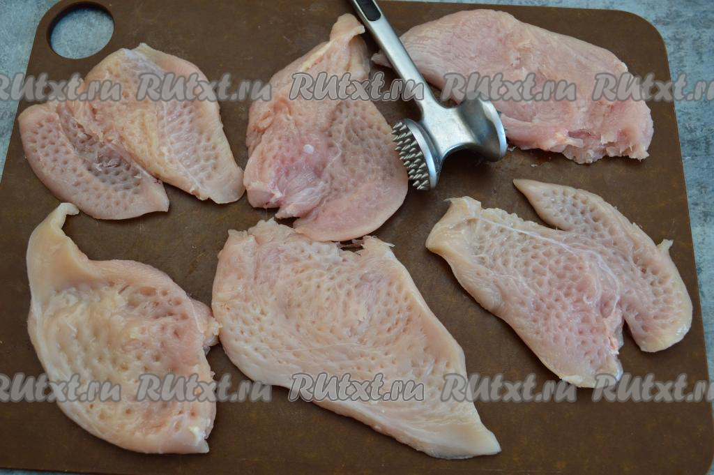 Куриное филе разрезать вдоль на пластины толщиной 1-1,5 сантиметра. Отбить кулинарным молоточком мясо с одной стороны до толщины 7-9 миллиметров.