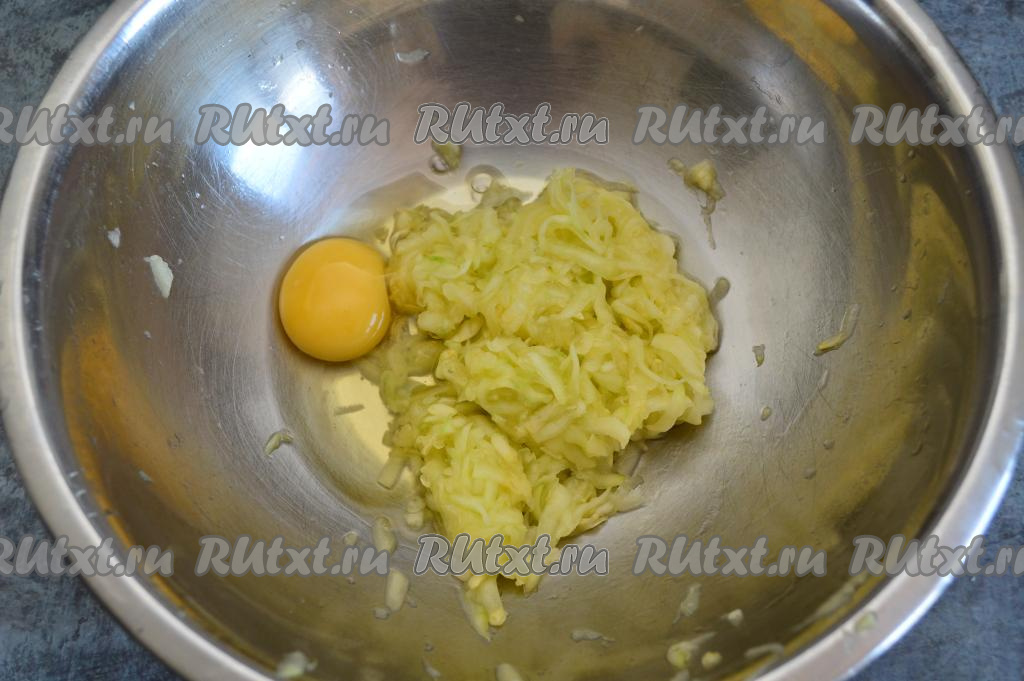 Кабачок натереть на крупной тёрке в миску, всыпать к нему щепотку соли, перемешать. Оставить кабачок на 5 минут, чтобы он пустил сок, затем сок тщательно отжать. К кабачковой массе, отжатой от лишней жидкости, добавить сырое яйцо.