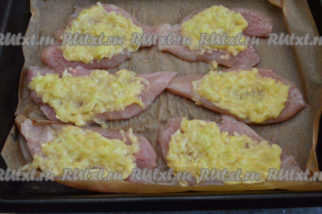 Готовые куриные отбивные с кабачками достать из духовки.