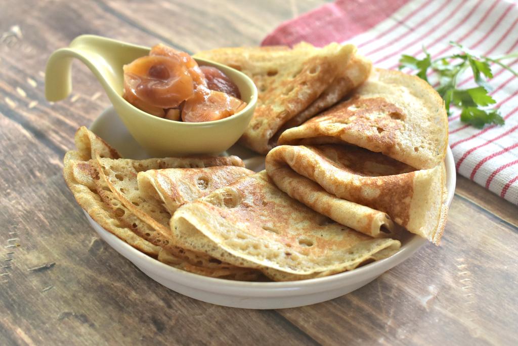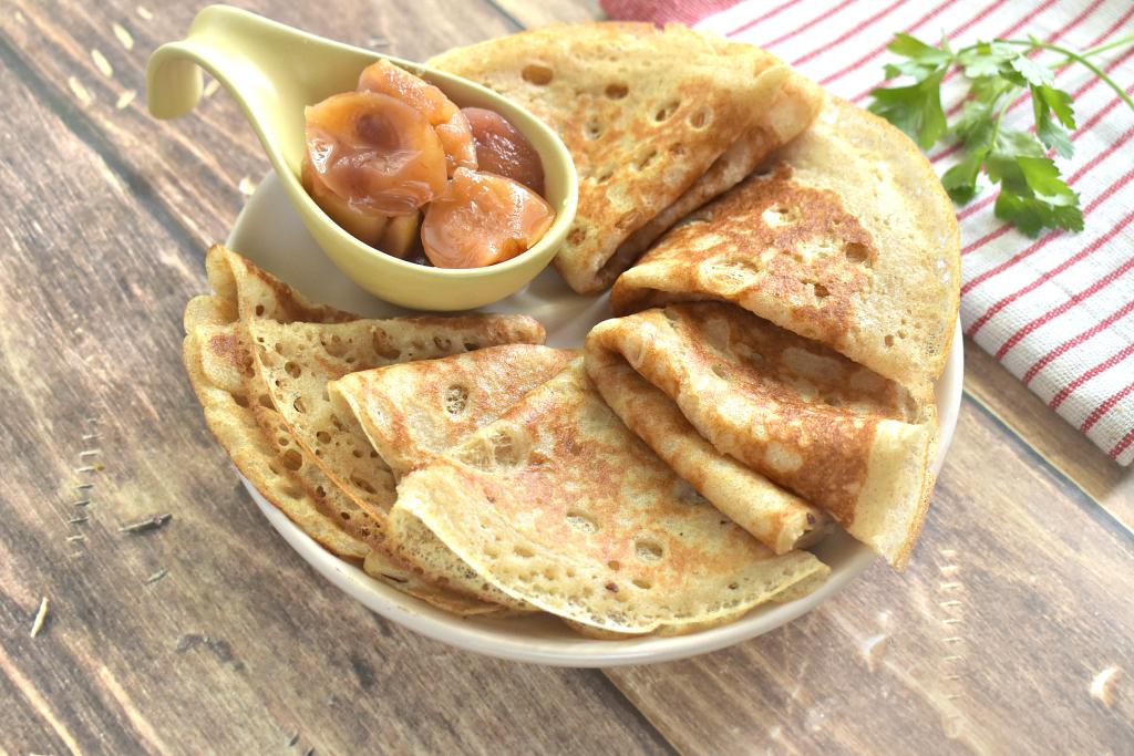 Дрожжевые блины, замешанные на воде без добавления яиц, получаются кружевными, мягкими, ароматными, я подала их к столу с яблочным вареньем.