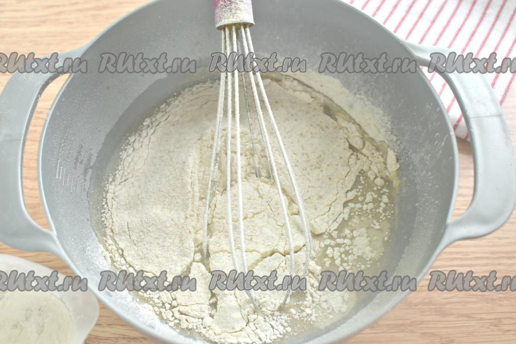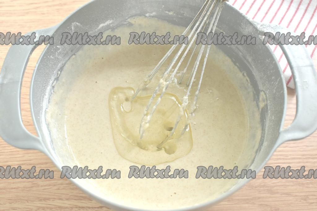 Тщательно перемешиваем. Должно получиться густое блинное тесто, сразу вливаем в него растительное масло и снова хорошо перемешиваем. Миску с тестом накрываем полотенцем (или крышкой) и оставляем при комнатной температуре на 45-50 минут.