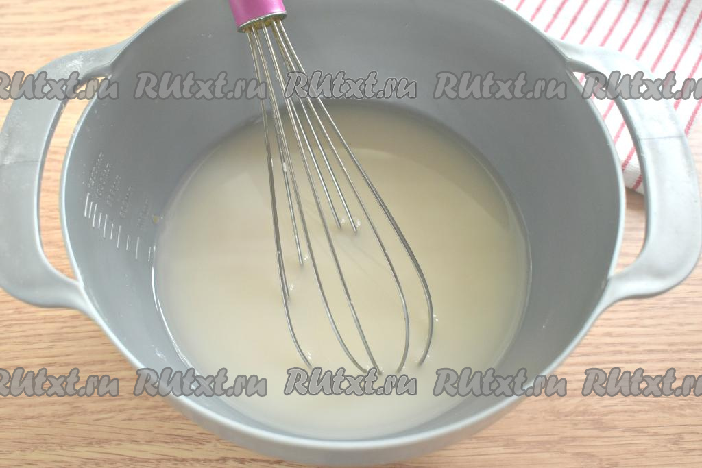 Дрожжи и сахар заливаем 450 миллилитрами тёплой кипячёной воды (температура воды должна быть не выше 37 градусов), тщательно перемешиваем дрожжевую смесь венчиком (до однородности).