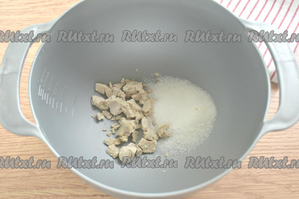Для замеса блинного теста выбирайте глубокую и широкую миску. Итак, крошим в миску прессованные дрожжи (или всыпаем сухие дрожжи). Добавляем к дрожжам сахар.