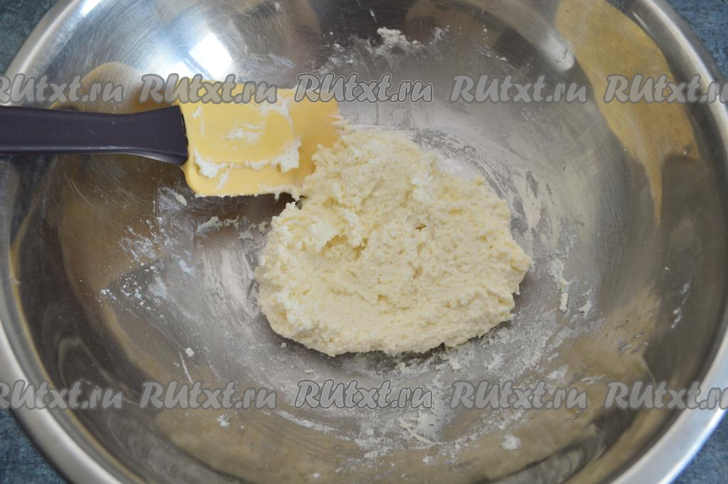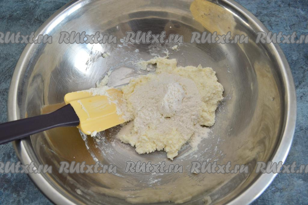 Всыпать 1 столовую ложку муки (примерно 20 грамм) и вмешать муку в творог.