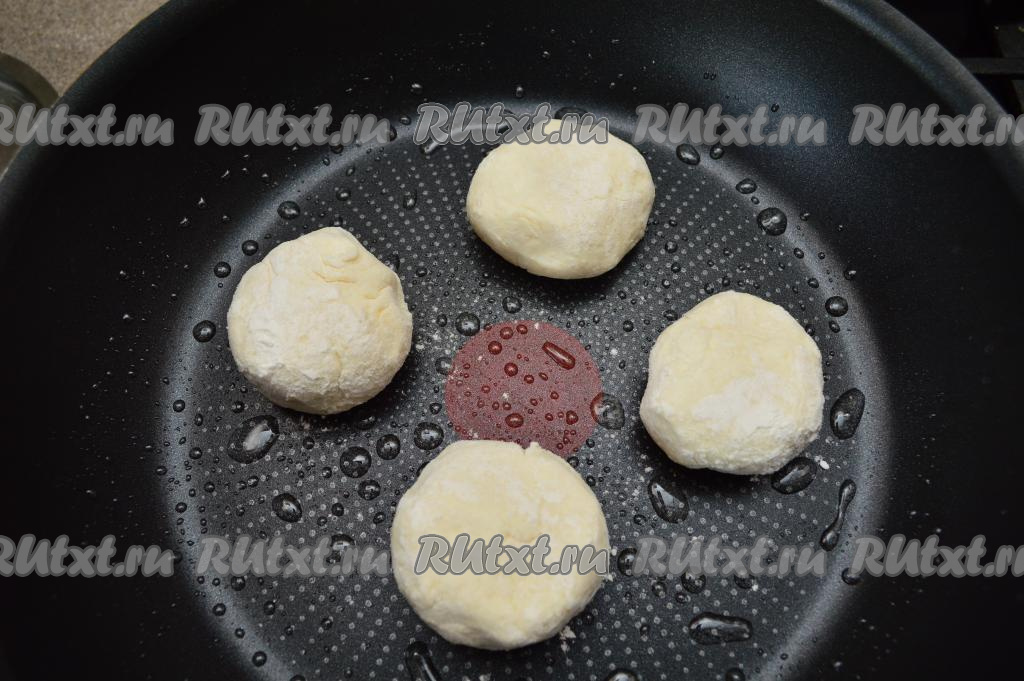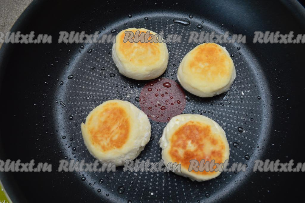 Хорошо разогреть растительное масло в сковороде, выложить сырники и обжарить их на среднем огне 2-3 минуты (до золотистой корочки снизу).