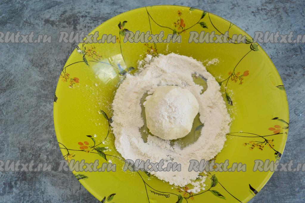 Разделить зрительно творожное тесто на 4 части. Руками, слегка смоченными водой, из одной части творожного теста сформировать округлый сырник, а затем со всех сторон обвалять его в муке.