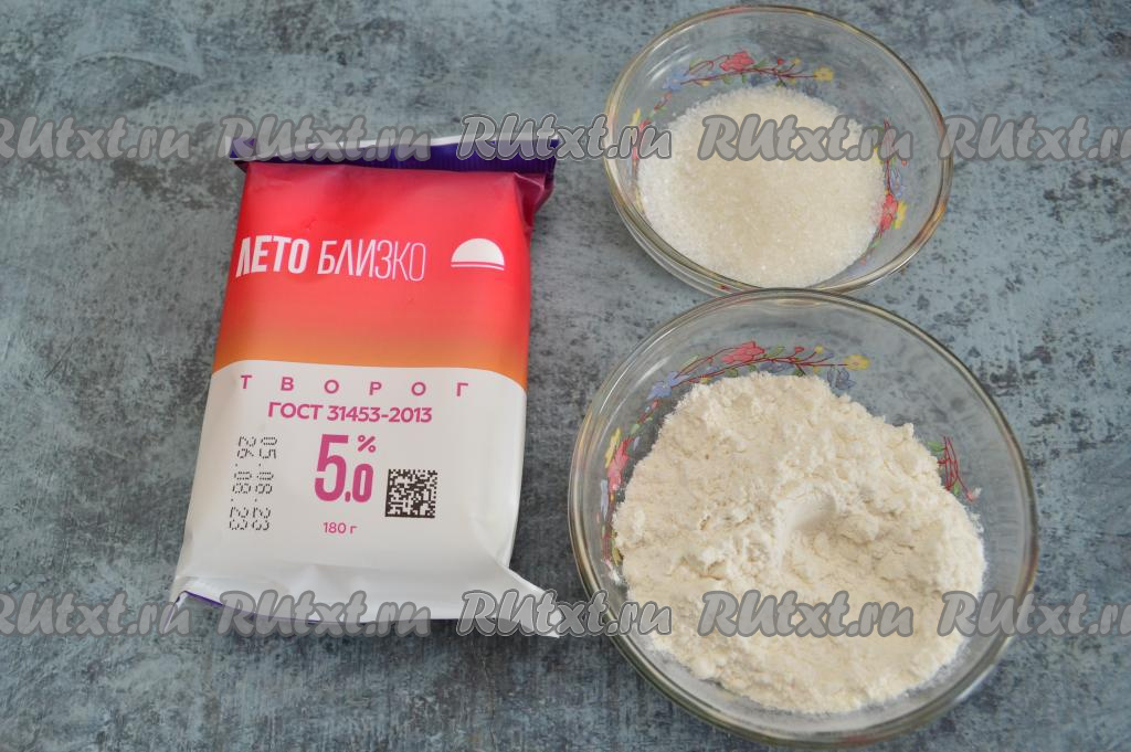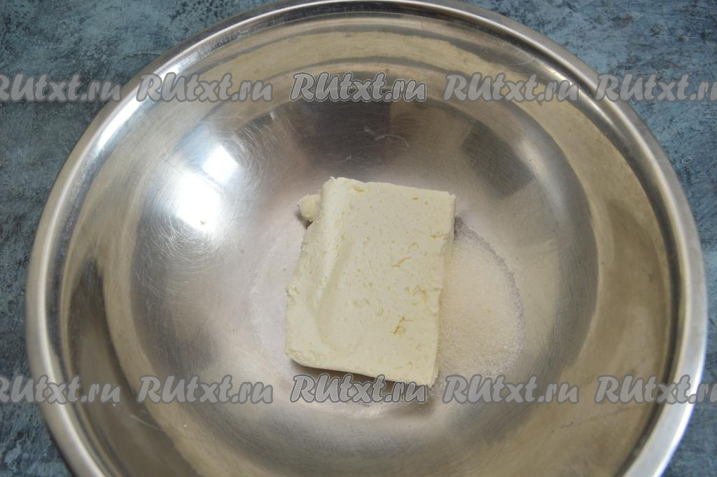 В глубокую миску выложить творог, всыпать к нему сахар.