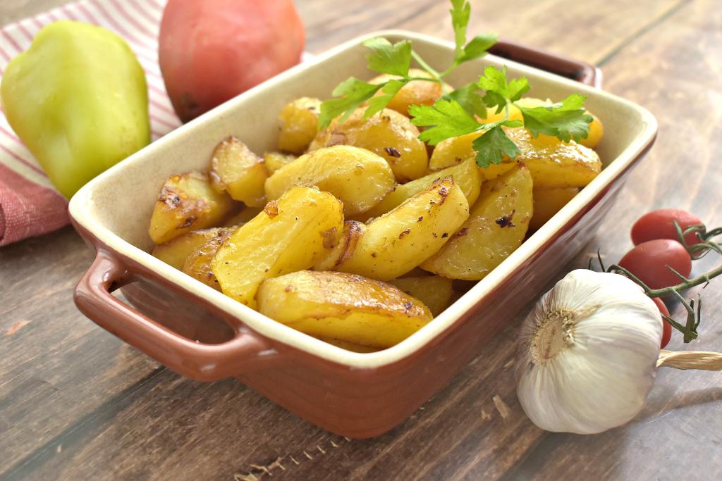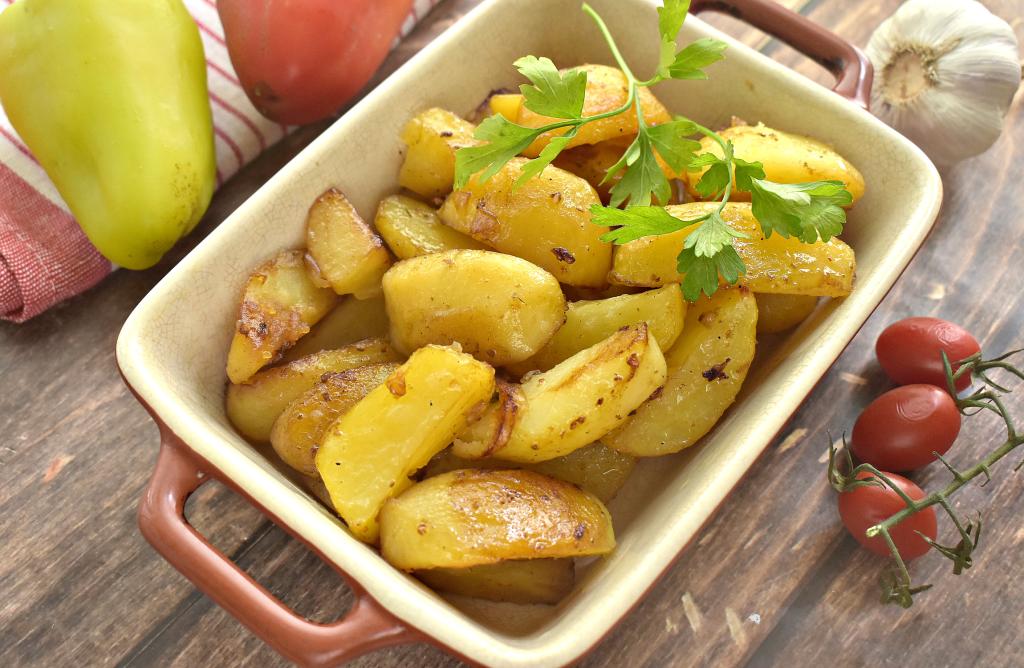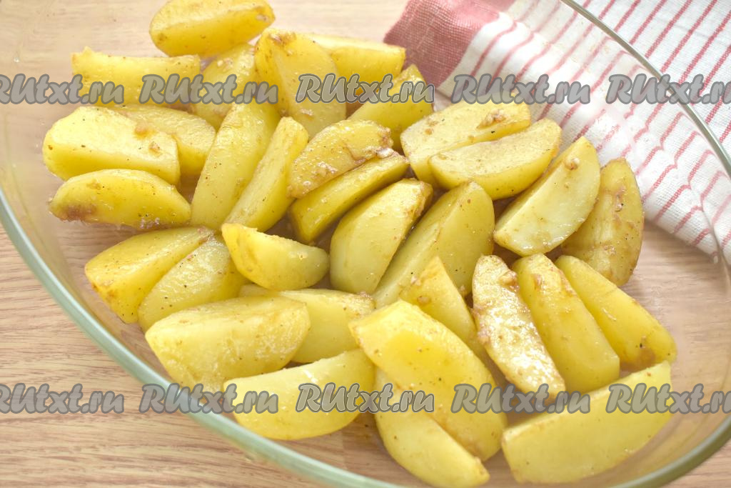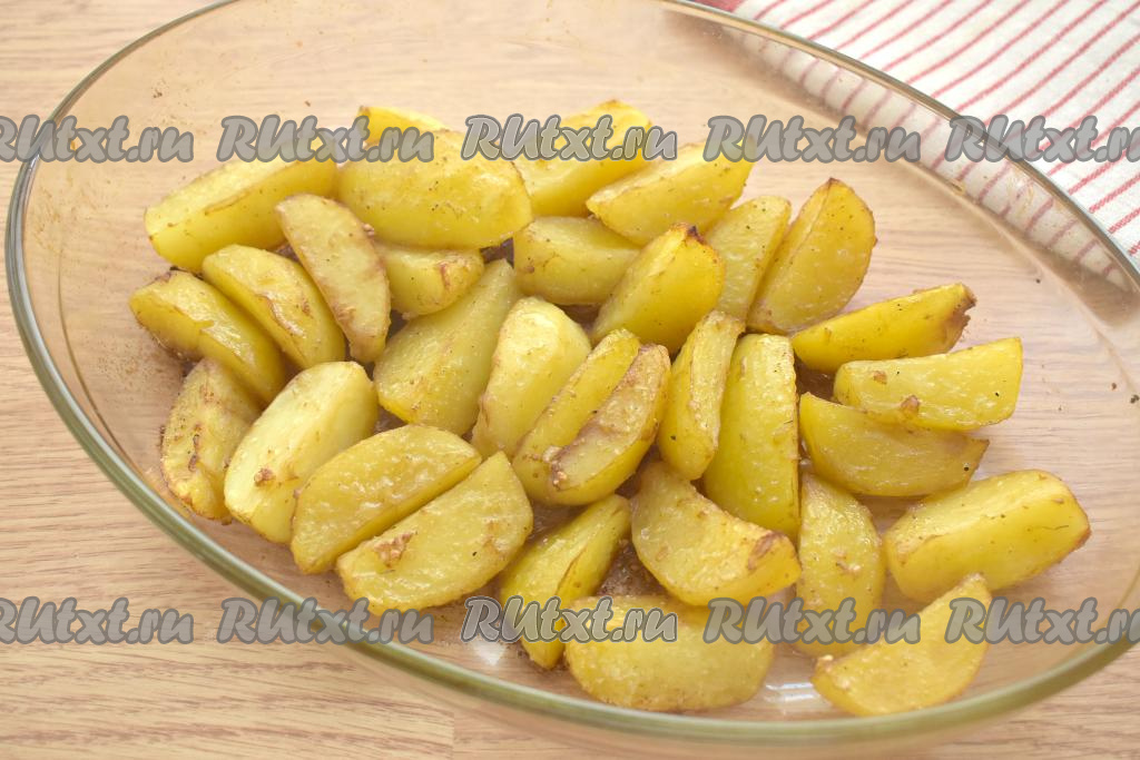Готовность можно проверить, проколов картофельные дольки ножом, если они легко прокалываются, значит блюдо готово.