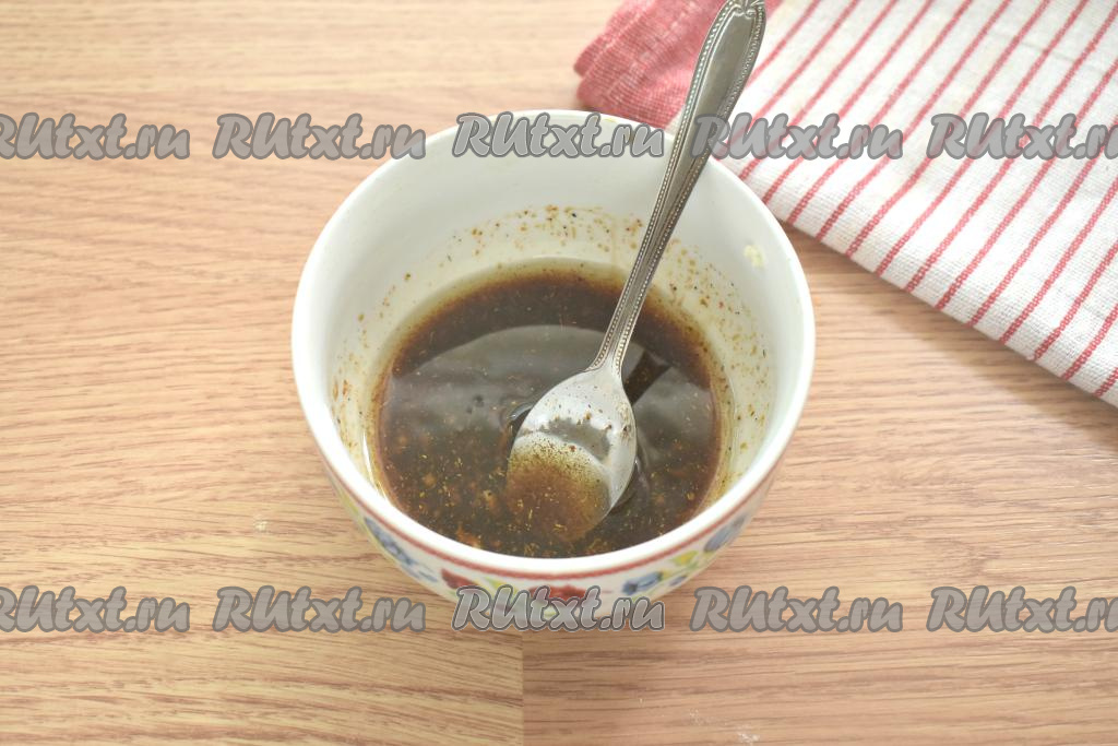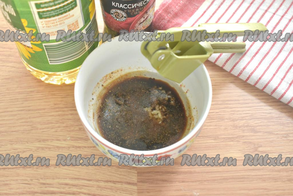 Пока картошка остывает, приготовим для неё соус. Для этого в миску вливаем растительное масло и соевый соус, добавляем очищенные зубчики чеснока, пропущенные через пресс, и специи (я взяла готовую универсальную приправу). Я использовала классический соевый соус, он достаточно солёный, поэтому картофель не солила, если любите довольно-таки солёные блюда, тогда можете добавить немного соли.