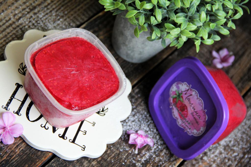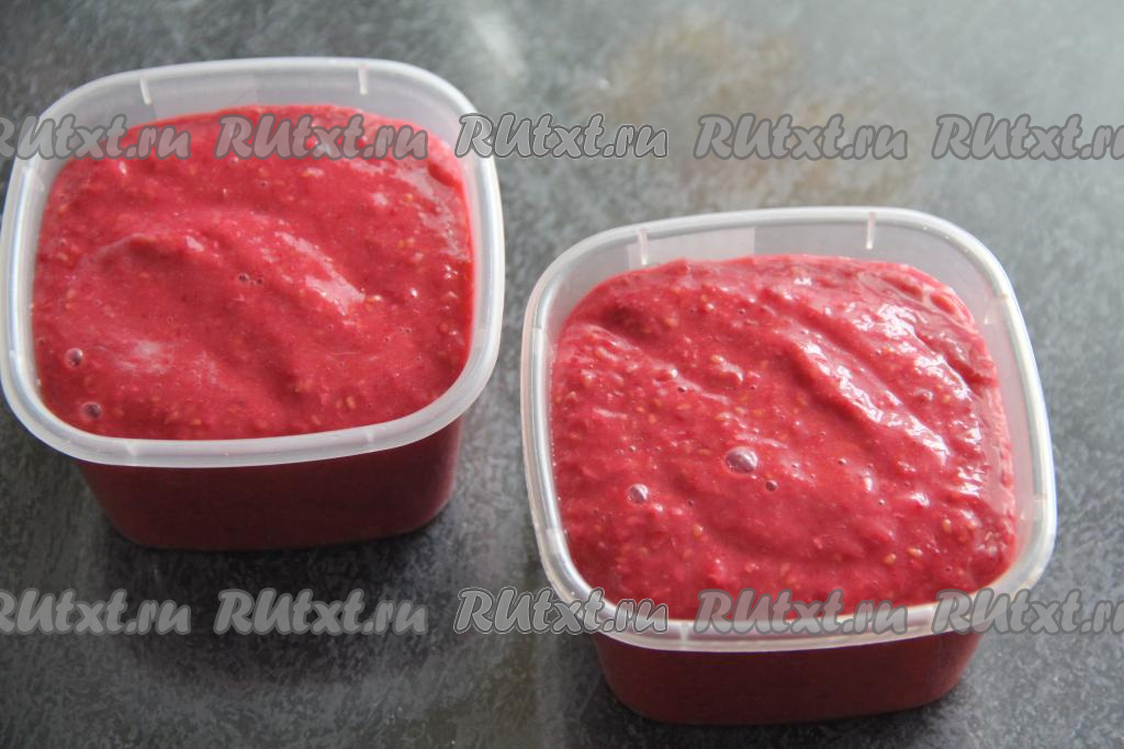Разложить получившуюся ягодную массу по пластиковым контейнерам (я разложила по 3 контейнерам объёмом по 200 миллилитров), закрыть крышками и отправить в морозилку.