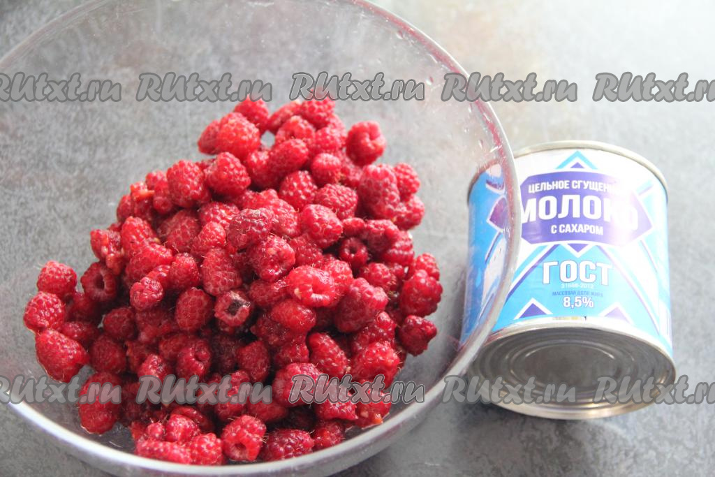 Затем переложить малину в миску, добавить сгущённое молоко.