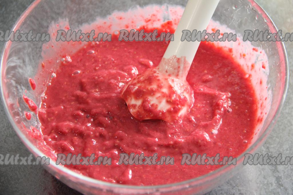 Пробить малину со сгущёнкой погружным блендером до однородности.