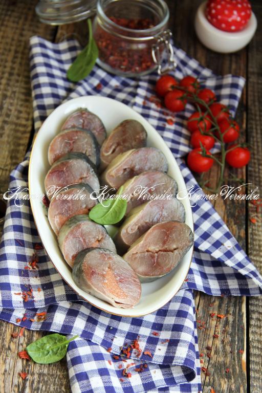 Свернуть скумбрию в рулет, начиная с широкой стороны, затем завернуть в пищевую плёнку, сформировав плотный рулет.
