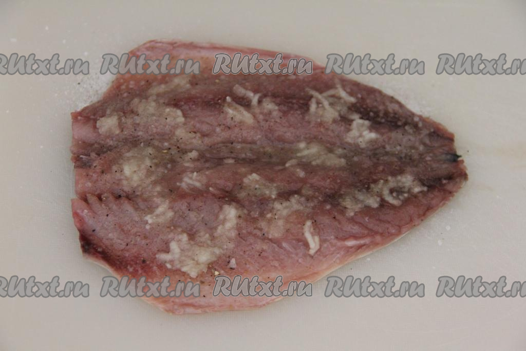Затем поверх филе равномерно разложить измельчённый чеснок.