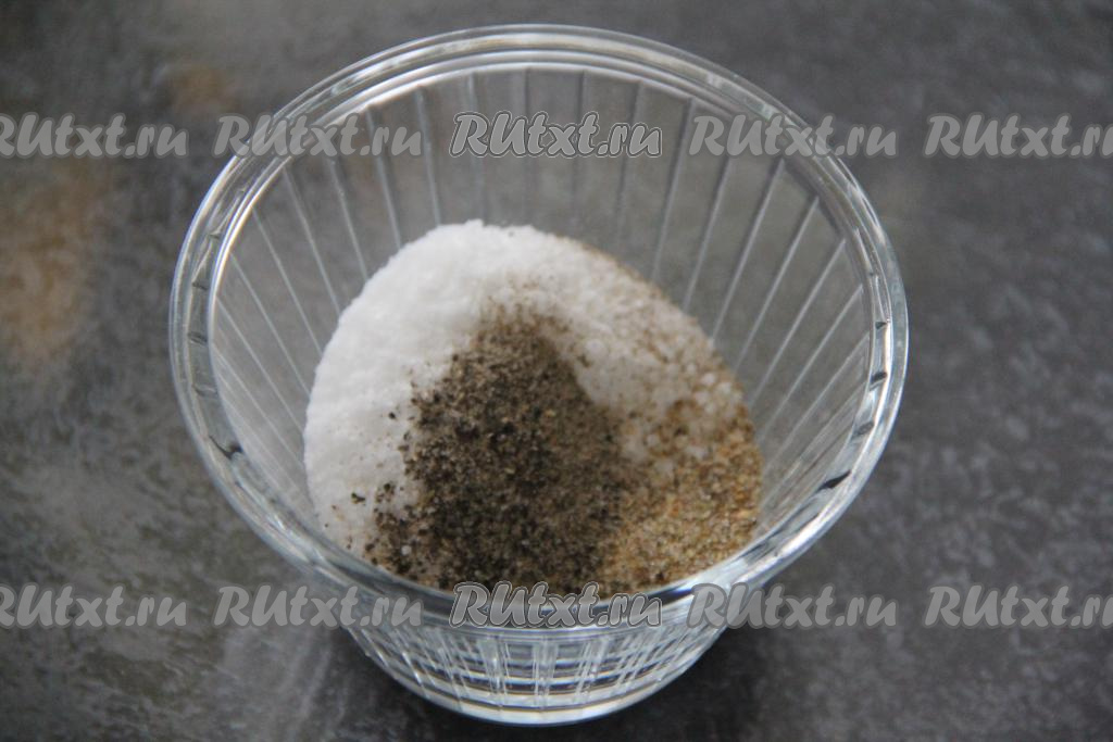 В небольшой ёмкости соединить соль, сахар и специи, перемешать получившуюся пряную смесь.