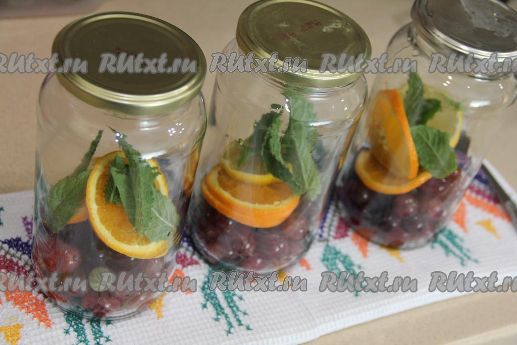Банки (у меня - 3 банки объёмом по 800 миллилитров) простерилизовать любым удобным для вас способом (я простерилизовала в посудомойке). Крышки прокипятить 3 минуты с момента закипания воды. Апельсин и лимон нарезать на кружочки вместе с кожурой. Косточки из цитрусовых удалить. В каждую банку выложить 200 грамм ягод, 2 кружочка апельсина, 1 кружочек лимона и 3-5 листочков мяты.